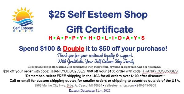 $25 Gift Certificate for Self Esteem Shop for you . Double it to $50 off a purchase of $100 or more.